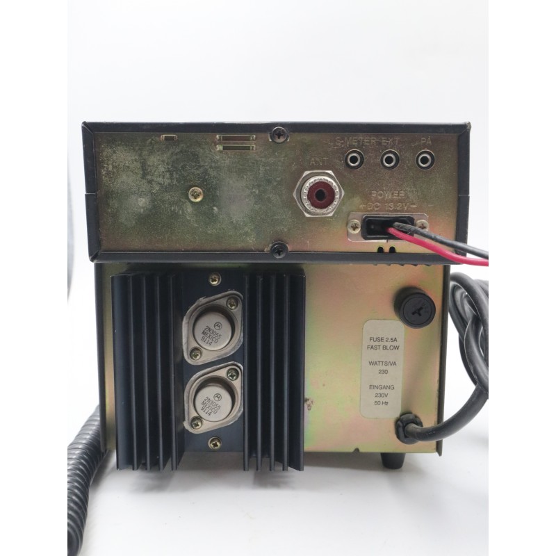 Zadní strana: Vidíme konektor pro anténu (SO-239), výstupy na externí reproduktor (EXT) a veřejný rozhlas (PA). Napájí se stejnosměrným proudem 13,2 V.