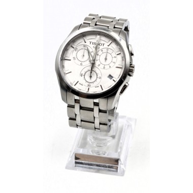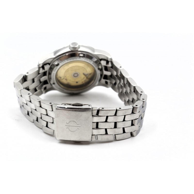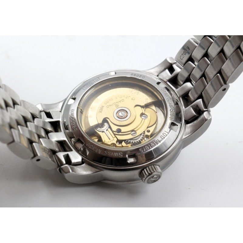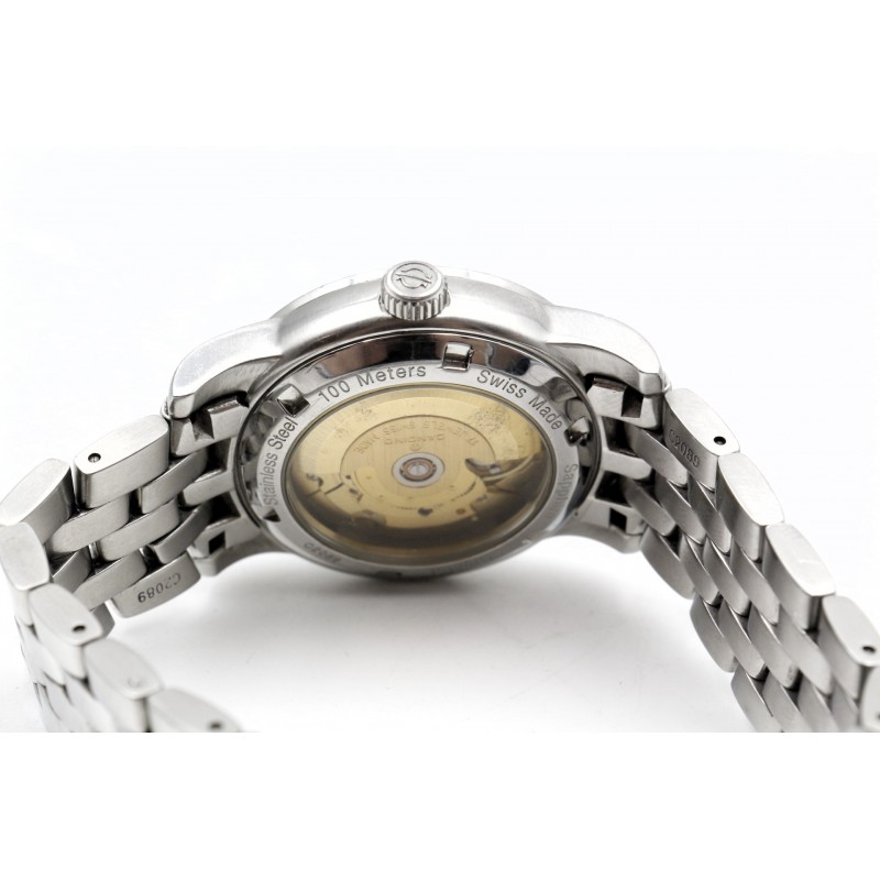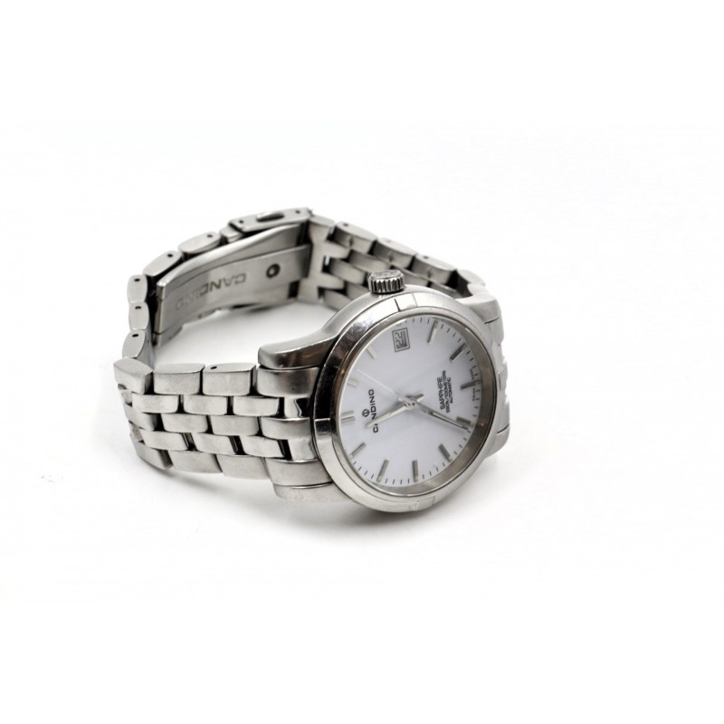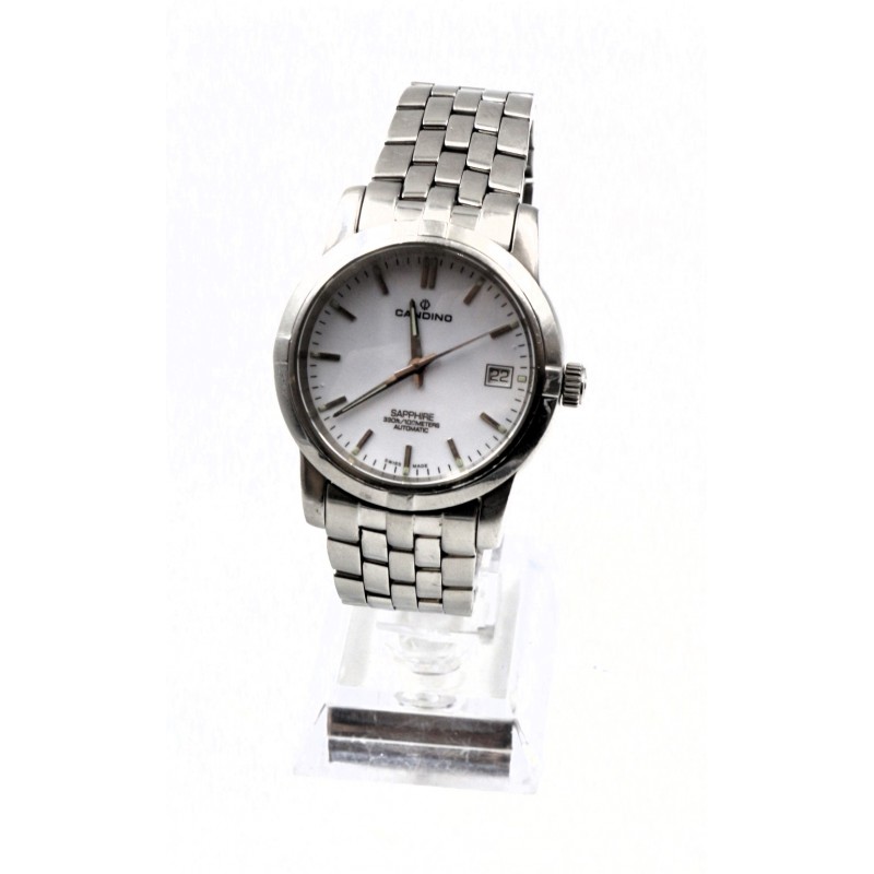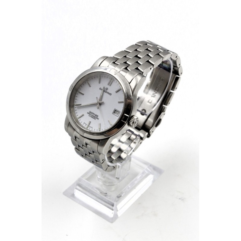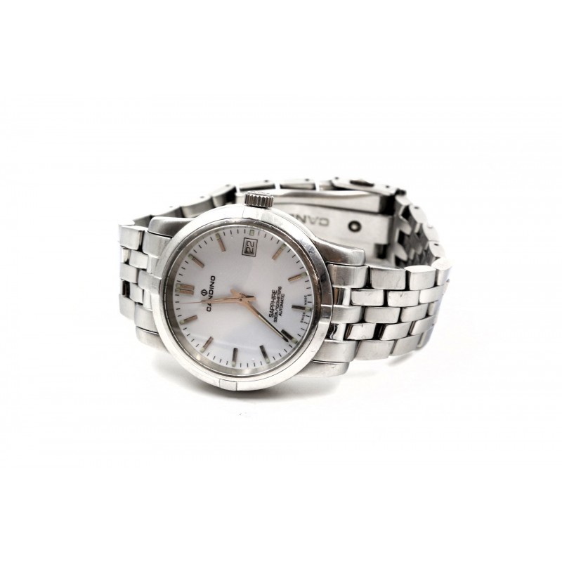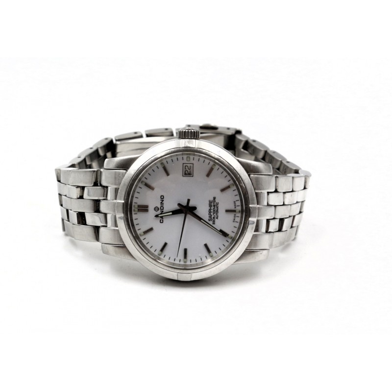 Klasické pánské hodinky s matným a leštěným stříbrným pouzdrem a náramkem z nerezové oceli. Ciferník je bílý s datumovkou. Má odolné minerální safírové sklo, přední i zadní, kde je vidět automatický mechanismus hodinek.