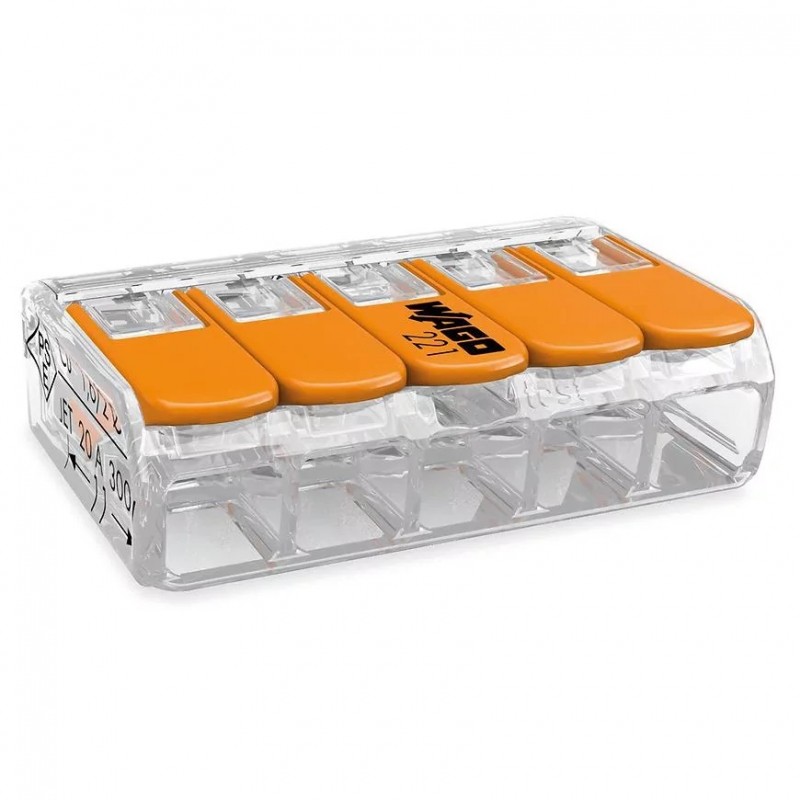 WAGO svorka pětinásobná pro pevné i lanové vodiče do průměru 4 mm, 450 V, 32 A, 4 kV, max. provozní teplota 105°C. Balení 20 ks.