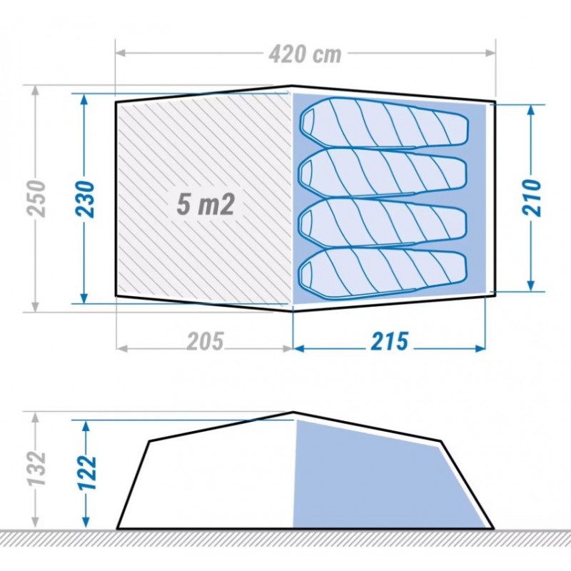 Velká apsida (předsíň/úložný prostor před ložnicí) má délku 205 cm a šířku 240 cm, tj. téměř 5 m². Takový prostor umožňuje pohodlné sezení ve 4 nebo uložení sportovního vybavení pod „střechu“ (batohy, boty, kola...).