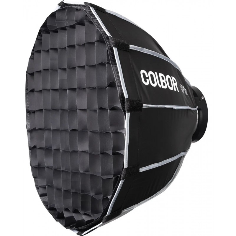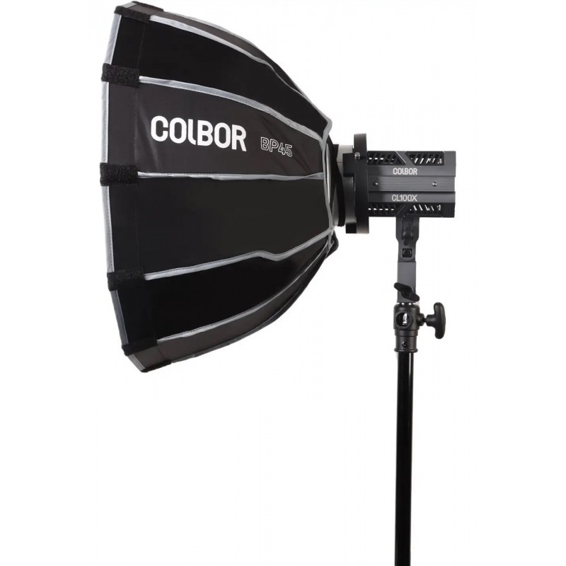 Colbor BP45 parabolický softbox s průměrem 45 cm efektivně změkčuje světlo LED světel CL60, CL60M, CL60R, CL100X a CL100XM. Součástí je látková mřížka pro omezení rozptylu světla a lepší směrovou kontrolu. Tento softbox zajišťuje rovnoměrné a měkké světlo, ideální pro portréty, produktovou fotografii a selektivní osvětlení scén, kde je požadován jemný, profesionální efekt. Snadná montáž díky Bowens mount.