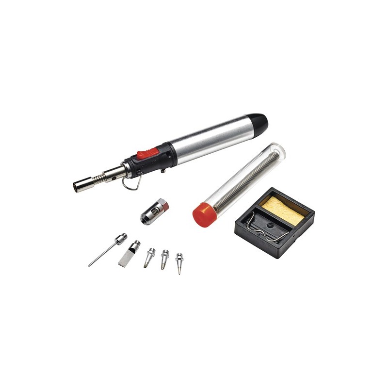 Souprava M 28 pro letování s plynem s pěti různými hroty. Velmi lehká, 10-ti dílná, více účelová pro jemné práce na různých kovech jako zinek, měď, hliník, stříbro, zlato apod. A také práce s plasty. Tavení na skle. Plnění normálním plynem pro zapalovače na spodní straně.