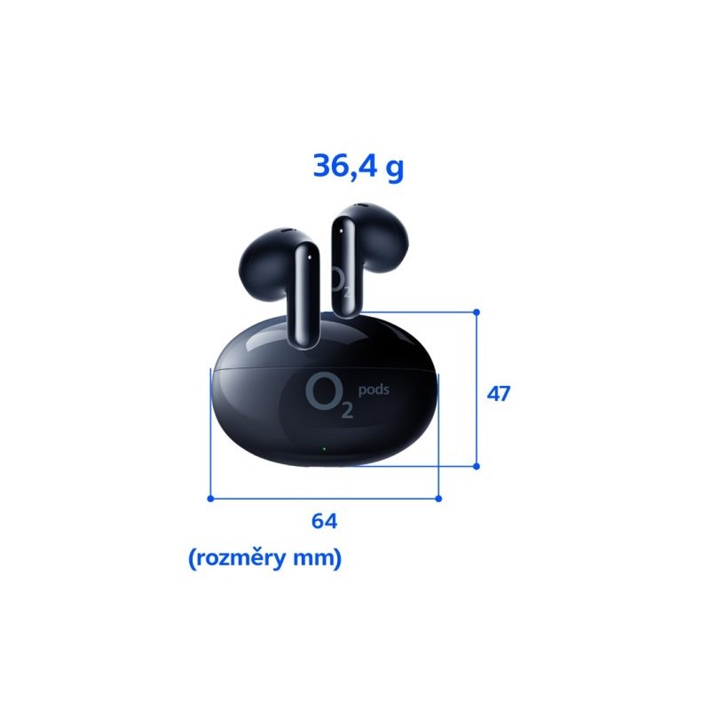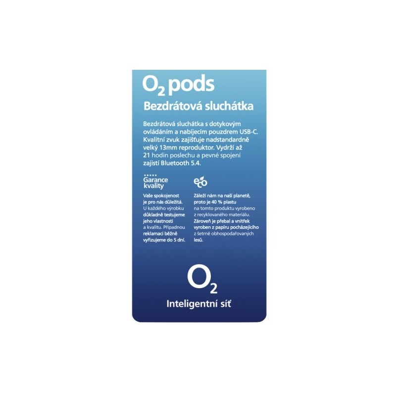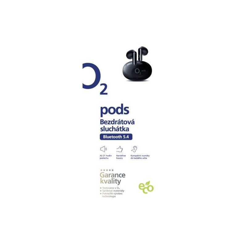 Bezdrátová sluchátka O₂ pods přinášejí dotykové ovládání, technologii True Wireless, automatické párování a Handsfree režim. Podporují také mono režim. Komfortní design zajišťuje, že sluchátka skvěle padnou do každého ucha. Na jedno nabití vydrží až 4 hodiny, s nabíjecím pouzdrem pak celkem 21 hodin. LED dioda. Sluchátka mají 13mm reproduktory (104 dB, impedance 32 Ω, frekvenční rozsah 20 Hz - 20 kHz), SBC kodek, Bluetooth 5.4. ECO: 40 % recyklovaného plastu. Obsah balení: sluchátka, nabíjecí pouzdro, USB-C/A kabel