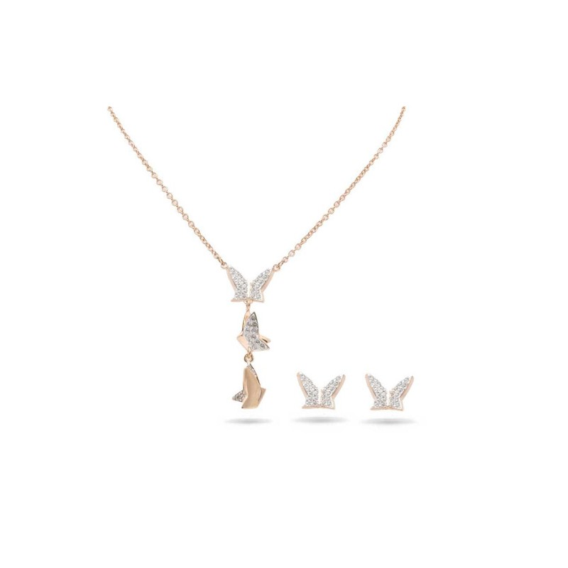 Obsahuje přívěsek ve tvaru motýla a odpovídající náušnice s bílým křišťálovým dlážděním.