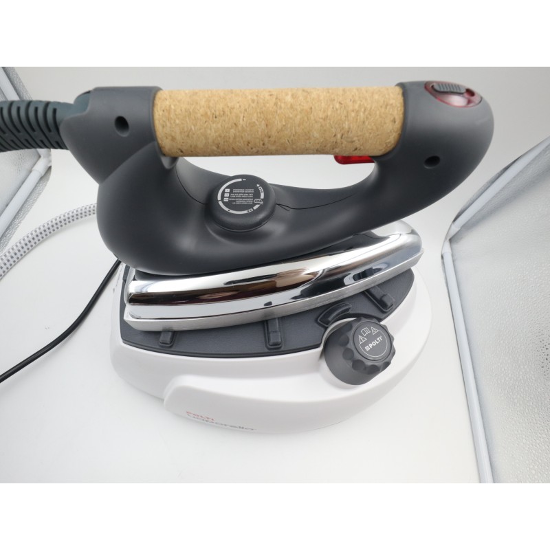 Žehlička i parní generátor mají oddělený spínač, takže je nemusíte zapínat naráz, pokud nechcete. Součástí sady je 900ml zásobník na vodu a nálevka. Na nutnost doplnění tekutiny vás upozorní světelný indikátor. Jistě oceníte také silikonovanou odkládací podložku, jejíž součástí jsou i protiskluzové body pro vyšší stabilitu.