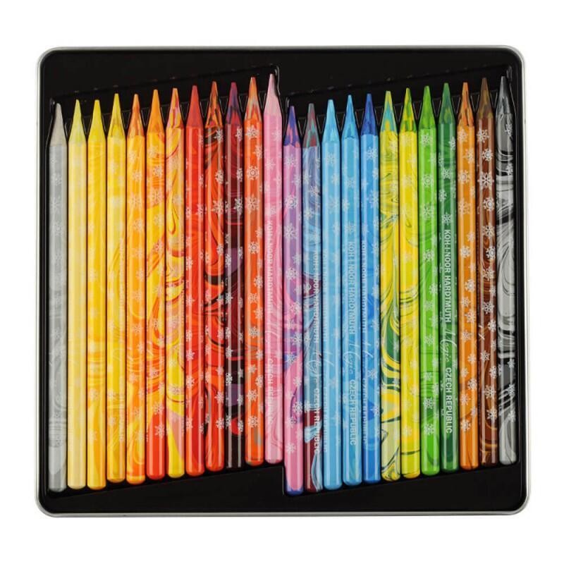 Kulaté lakované pastelky Magic mají speciální trojbarevnou tuhu - tři barevné odstíny v jedné pastelce. Natočením hrotu se mění barva stopy. Pastelky jsou jedinečné při vybarvování větších ploch, na nichž se střídají různé odstíny, např. tráva, moře apod. Výsledný efekt kresby je plastičtější než při stínování klasickou pastelkou. Blender s nepigmentovanou tuhou se používá ke smíchání jednotlivých barevných stop a odstínů, aby hotová kresba působila přirozeným, komplexním a homogenním dojmem. Průměr pastelky 7,6 mm, délka 153 mm. Kovová kazeta obsahuje 23 pastelek a 1 Blender.